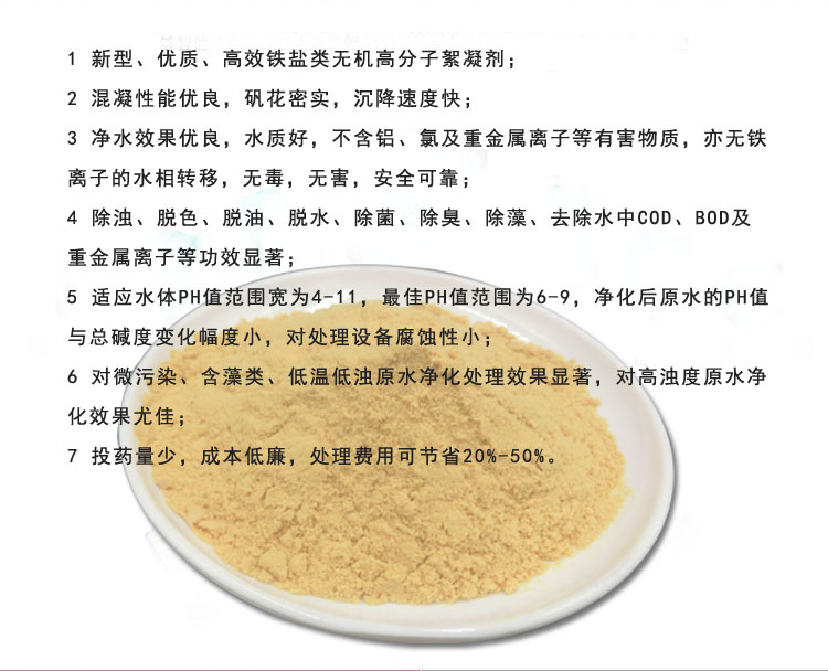 聚合硫酸鐵性能穩(wěn)定,凈水效果優(yōu)良,不含重金屬離子等有害物質(zhì),具有脫色、脫臭、脫油、除菌、脫除水中重金屬離子、放射性物質(zhì)及致癌物等多種功效。對(duì)COD,BOD及色度的去除率高達(dá)90%以上,對(duì)低溫低濁度及高濁度原水凈化效果甚佳。聚合硫酸鐵使用方便,成本低廉,處理費(fèi)用與使用其它無機(jī)絮凝劑相比,一般可節(jié)省20%-50%。使用時(shí)固體聚合硫酸鐵配成10%--30%的水溶液,然后根據(jù)具體情況將配好的溶液按合適的條件和藥量投入,經(jīng)充分?jǐn)嚢韬罂傻玫胶线m的混凝效果。用量可根據(jù)原水的不同渾度,測(cè)定最佳投藥量,一般混濁(濁度在100-500mg/L)水,每千噸使用本品30-50公斤,非飲用水高濁度工業(yè)污水可適當(dāng)投加量 。