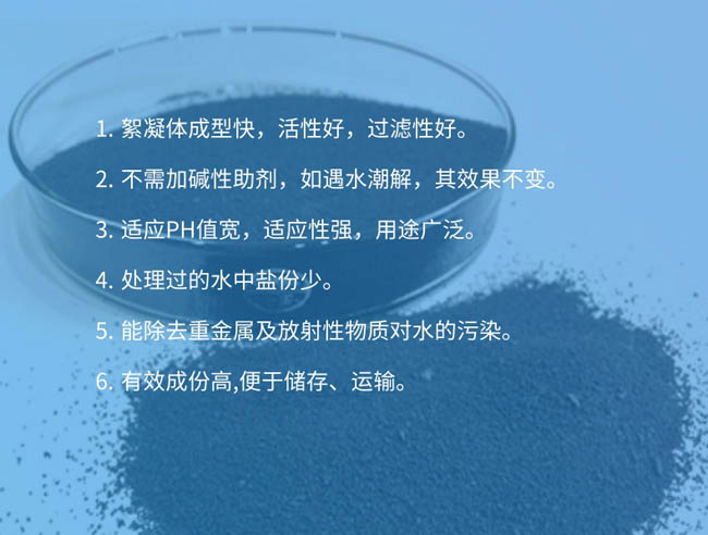 5、腐蝕性小,操作條件好,溶解性優(yōu)于硫酸鋁。